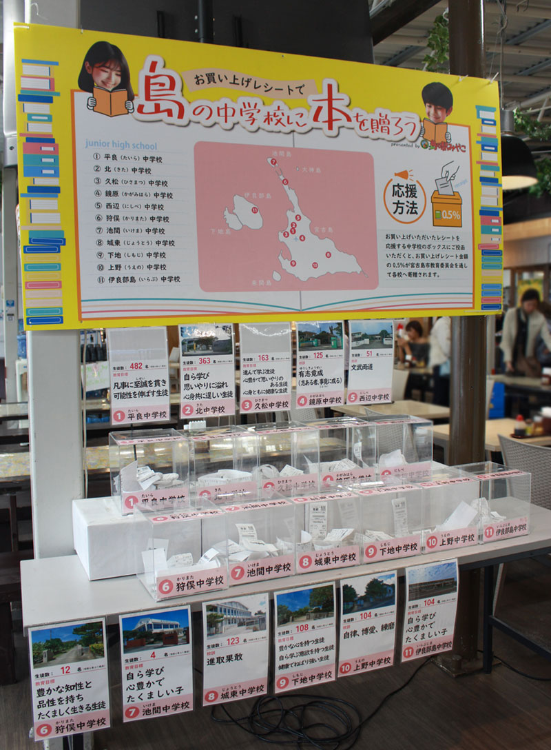 島の駅みやこ本店では、2024年5月より「島の中学校へ本を贈ろうプロジェクト」を開始しました。地域の皆さまや来店者の温かいご支援により、この取り組みは実現しています。